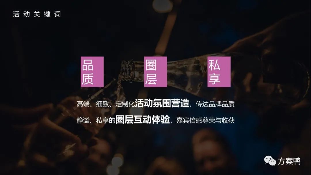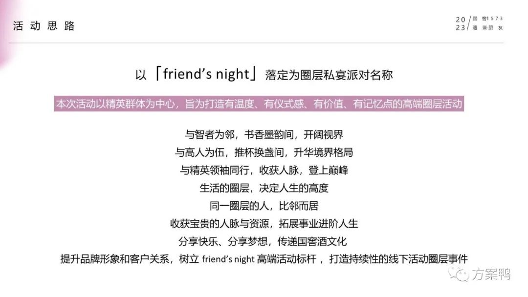 本方案分享的是《2023白酒品牌高端圈层私享会“遇鉴·朋友”主题活动策划方案【白酒品鉴会】_pptx》,53页,部分内容展示如下: