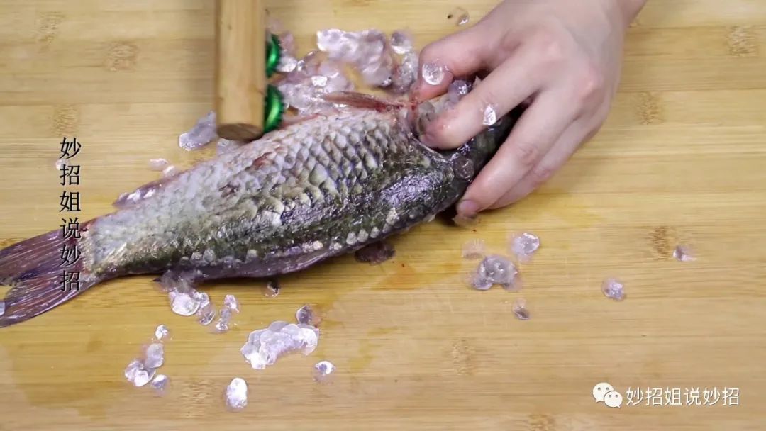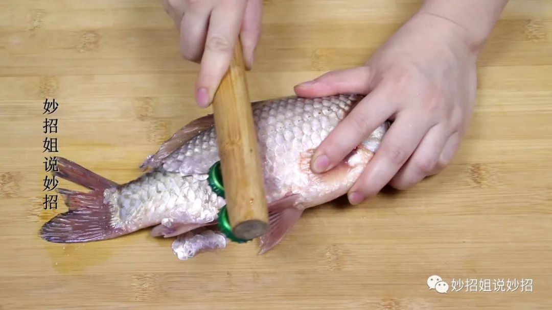 但有时候我们自己钓的鱼,或者别人送的鱼,就需要自己在家处理了。处理鱼的第一步就是要刮鱼鳞,可能很多朋友刮鱼鳞就是直接用刀来刮的,这样不仅刮不干净,而且稍不注意,还容易伤到手。其实刮鱼鳞,我们就可以利用上刚刚用擀面杖和瓶酒瓶盖做成的神器,只需要一手固定住鱼,一手拿住擀面杖没有固定瓶盖的一端,然后用瓶盖从鱼的下半部分往上刮。