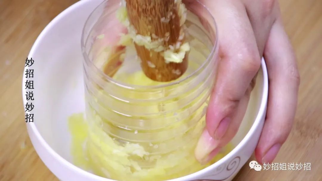 剪好再把瓶子的中间部分放在碗里,把大蒜归拢在瓶子的内部,这样再用擀面杖来捣蒜泥的话,大蒜就不会飞的到处都是了,而且这样捣蒜泥的力量也会更加集中,简单几下就能快速的将蒜泥捣好了。