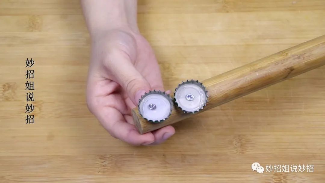 平常我们在家里自己做饺子的时候,都会使用到擀面杖,擀面杖用的时间长了,就容易发霉或者变旧,这样的擀面杖我们也不要把它扔掉,还可以将它利用起来。只需要准备两个啤酒瓶盖,然后再准备两个钉子,用钉子将啤酒瓶盖固定在擀面杖的一端。固定好后就改造完成了,下面我们来看看它有什么作用吧。
