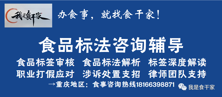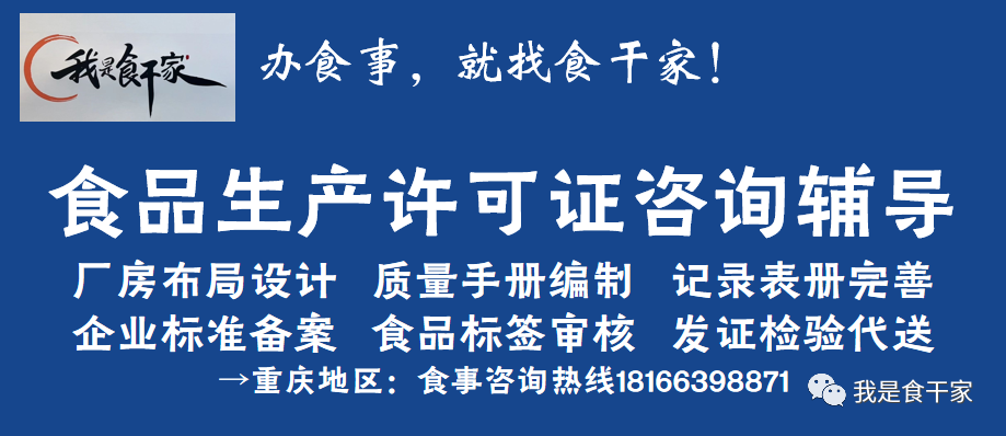 “我是食干家”专注于重庆地区食品生产许可证咨询辅导、食品标签审核,为食品企业提供标签投诉标法分析及应对处置建议,欢迎留言咨询微信公众号!在微信搜索“我是食干家”或者点击下方公众号卡片关注。