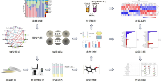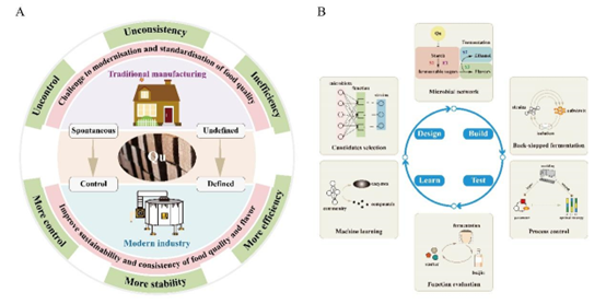 一直以来,中国白酒始终以科技创新作为产业发展的不竭动力,众多新研究成果的涌现,不断开拓对白酒新的认知深度与广度,北京工商大学酿酒工程系在国际食品科技期刊发表论文,对白酒制曲过程中的微生物相互作用进行探索,在探寻白酒之秘的道路上更进一程。我国酿造食品(白酒、黄酒等)生产通常以曲作为发酵剂,以实现糖化和发酵的同步进行,该特点是东方酿造区别于西方酿造的典型特征之一。我国劳动人民在长期的生产实践中,发明了许多不同用途和特点的曲,酿造出了品种繁多的各色酒类。曲的制作以谷物作为培养基质在合适的条件下从酿造环境中富集微生物,并逐步形成独特的“菌系-酶系-物系”为一体的微生态系统。我国传统的制曲技术蕴含着许多科学道理有待深入解析,如“曲中微生物群落和酶系的组成特征、演替规律和代谢功能是什么?”“制曲过程中微生物成员间及其与环境的相互作用机制是什么”“传统生产中微生物群落形成及代谢产酶的驱动机制是什么?”以及“如何构建合成群落复刻原位菌群的代谢特征?”等。长期生产实践与科学研究表明,外部环境因子与内部微生物相互作用是共同维系制曲微生态稳定的关键要素,调节与控制该系统的稳定性对曲的质量起着关键作用,对后续酿造过程具有重要影响。近年来蓬勃发展起来的微生物组学技术在制曲微生态研究上取得了一系列重要进展,比如不同曲中微生物群落组成及形成机制研究,揭示了制作工艺、发酵环境和地理生态等因素对功能微生物菌群的选择作用,明确了外部环境因子对制曲过程中微生物群落形成及代谢的影响(图1)。相对外部环境因子的驱动作用,2022年12月,北京工商大学孙宝国院士团队王柏文、孙金沅、郝慧宜等在国际食品科技期刊《国际食品微生物学杂志》(International Journal of Food Microbiology)(1区,IF: 5.911)发表了题为“中国白酒发酵过程中挥发性有机化合物介导的内源性微生物相互作用”(Volatile organic compounds mediated endogenous microbial interactions in Chinese baijiu fermentation)的研究论文,介绍了白酒制曲过程中功能微生物的互作机制及潜在调控策略,探讨了群落内部相互作用对维持制曲微生态稳定的影响。图1 不同曲中微生物群落结构(A)、功能微生物(B)及群落形成机制(C)该论文的研究内容包括如下方面:(1)采用扩增子测序技术揭示了该过程中微生物群落组成及演替规律,进而结合统计学分析明确了原位体系中功能微生物之间的相互作用;(2)以原位体系分离纯化的功能微生物为对象,采用双碟法结合非接触培养模式,验证了各微生物成员间的相互作用;(3)在单菌培养模式下鉴定供体微生物产生的主要挥发性有机化合物,再依次扰动受体微生物的生长,进而基于受体微生物的生长情况确定具有显著影响的化合物;(4)采用转录组学技术比较分析了在化合物扰动与非扰动模式下受体微生物的代谢差异,以关键化合物在微生物细胞间的感应与通讯机制。上述研究表明:微生物释放丰度的挥发性有机化合物,在微生物种内或种间的远程互动或交流中扮演重要角色;这些物质通过细胞壁或细胞膜扩散,影响微生物细胞生长或代谢,以促进成员间的协同生长(图2)。该研究也提供了一种潜在策略,通过调节体系内挥发性有机化合物以干预制曲过程中功能微生物的生长或代谢,有待深入研究。当前传统制曲技术依然较多采用开放式、自然式的发酵方式,其制曲的品质均一性与批次稳定性一直受到挑战。然而,面对制造业和劳动力成本上升的挑战,传统自然发酵的制备方式已不能满足当前快速工业发展的需求以及对产品质量的期待,生产的标准化和现代化改革之路势在必行。从上世纪的可培养分析到当前的微生物组学研究,已积累了丰富的知识,明确了传统曲中的关键功能微生物或酶,并从外部环境因子和内部微生物互作等角度揭示制曲微生态下群落形成的驱动机制。然而,受复杂工艺流程、品控与生产力的波动性影响,优质曲的标准化、现代化生产,依然是一个不容易实现的改革过程。相信随着经济的快速发展与新型生物技术的开发应用,优质发酵剂的从头设计到标准化生产必将实现,以保证酿造食品的品质均一性及食品安全。收集整理:我是食干家,文章来源:中国酒业协会CADA微信号,转载请注明出处。