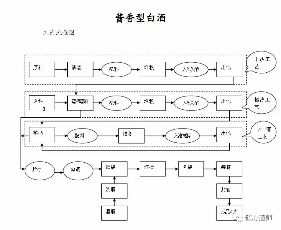 酱香型白酒酿造的基本工艺是指“一二九八七”工艺。即端午制曲、重阳下沙、一年一个生产周期、两次投料、九次蒸煮、八次发酵、七次取酒。