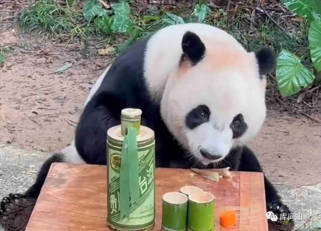 国宝当然没喝酒,只是用竹子做成了酒瓶酒杯的样子