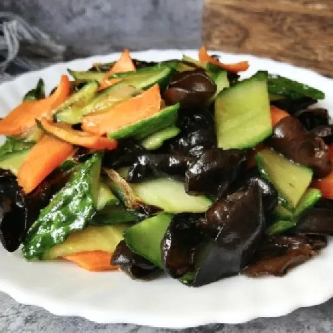 黄瓜炒木耳:黄瓜45g、胡萝卜5g、木耳1g