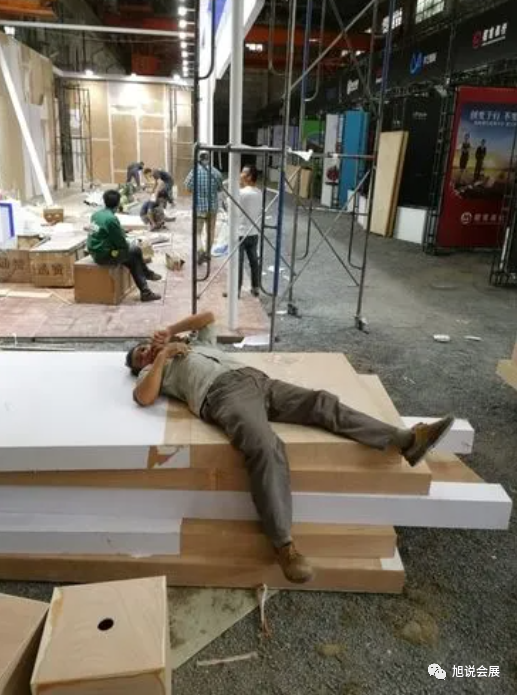 他们很多人天天熬、月月熬、年年熬。每次的会展现场,他们都要提前到场搭建展台。展台的搭建有时需要数天,他们需要迅速搭出美观大方的展台,满足客户(参展企业)和现场观众的品味和需求。