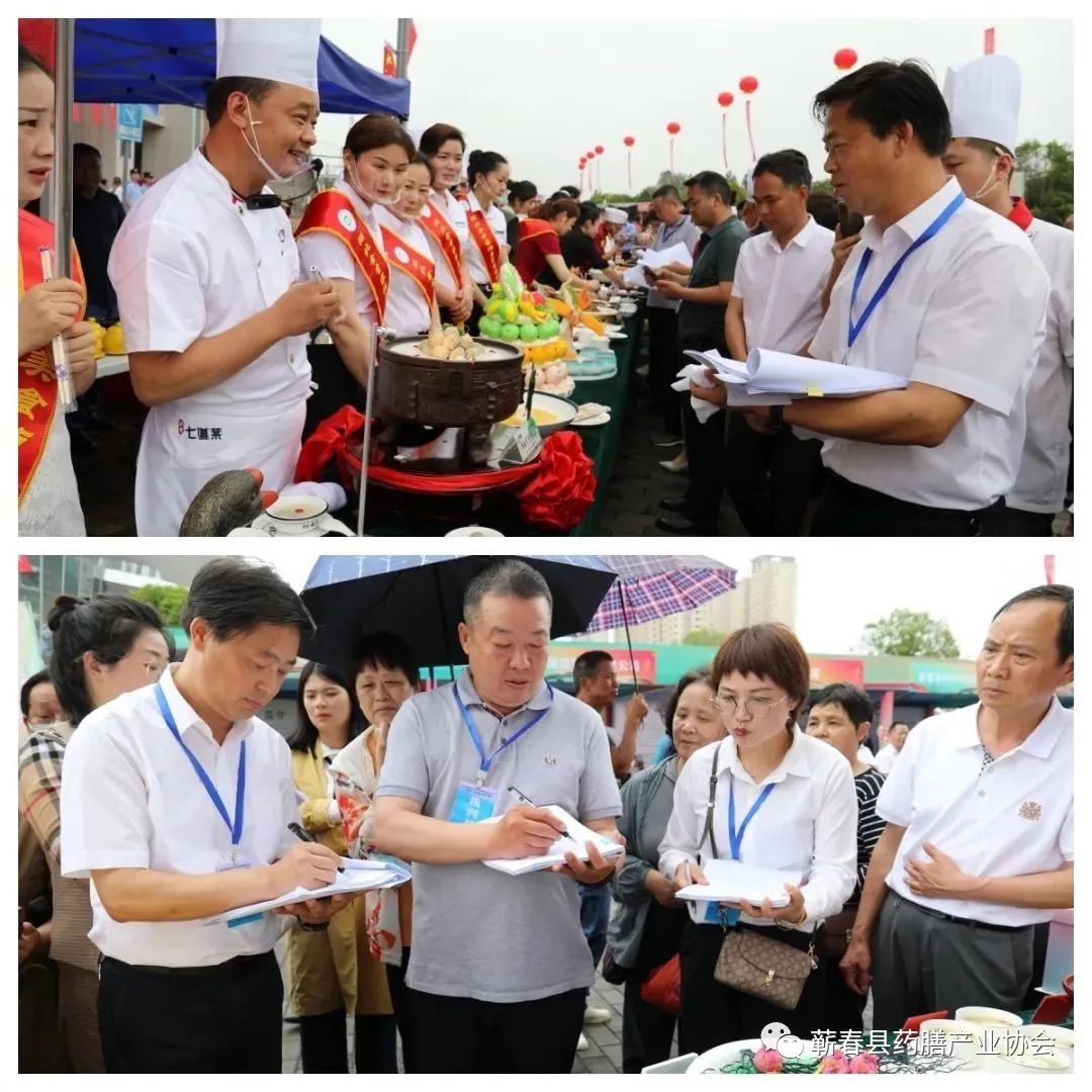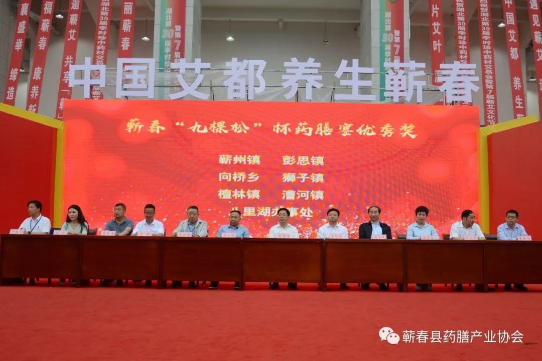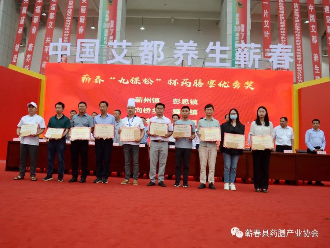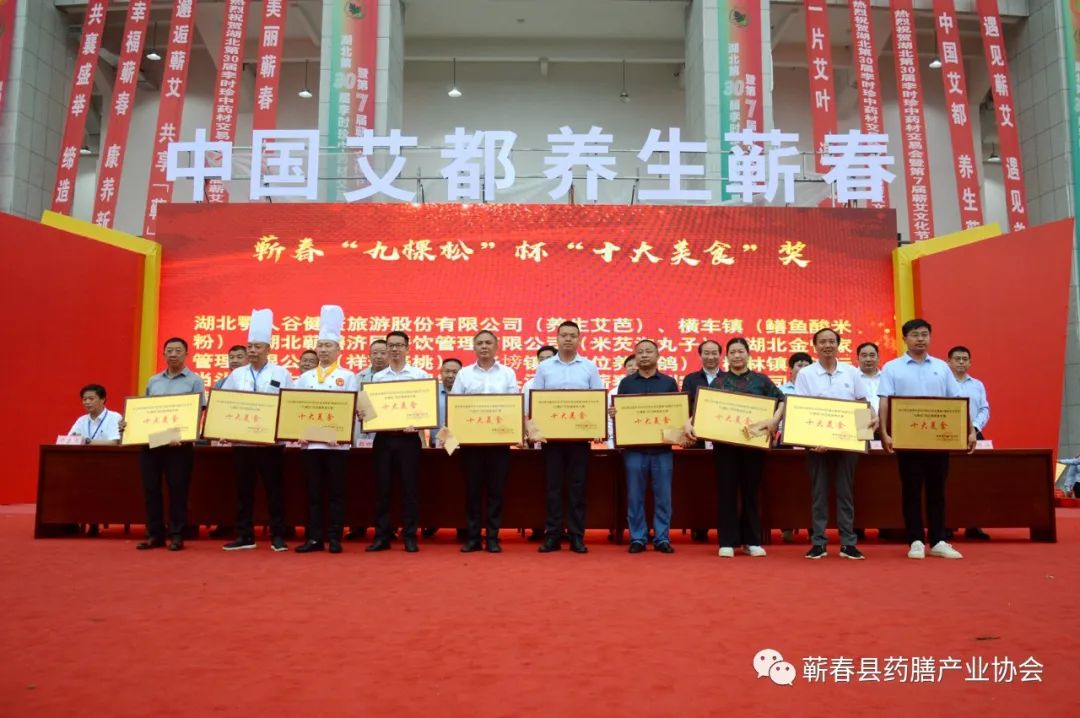 湖北卾人谷健康旅游股份有限公司选送的《养生艾粑》、横车镇选送的《鳝鱼酸米粉》、湖北蕲膳济民餐饮管理有限公司选送的《米芡泡丸子》、湖北金管家管理有限公司选送的《祥瑞寿桃》、张榜镇选送的《五位养生鸽》、檀林镇选送的《鸿运当头》、大同镇选送的《仙人湖生态鱼头汤》、蕲春江洲寨餐饮有限公司选送的《蕲艾蕲芹粘米元》、株林镇选送的《雪花糕》、天马集团选送的《紫米山药鳗鱼丸》荣获蕲春“九棵松”杯“十大美食”奖,主席台领导为10家获奖单位颁发“十大美食”奖匾、奖金。
