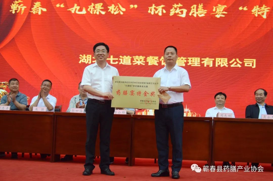 湖北七道菜餐饮管理有限公司荣获蕲春“九棵松”杯”药膳宴“特金奖”,蔡寿益主任为获奖单位颁发特金奖。