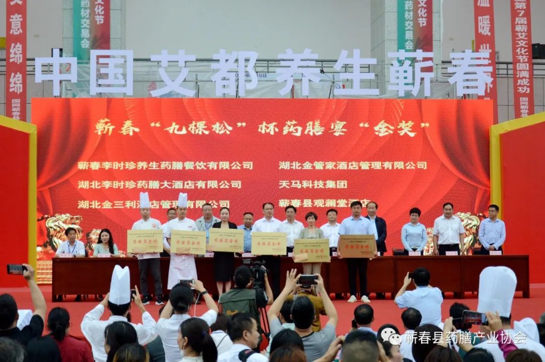 湖北李时珍药膳大酒店有限公司、湖北金管家酒店管理有限公司、湖北金三利酒店管理有限公司、蕲春县观澜堂酒店、天马科技集团、蕲春李时珍养生药膳餐饮有限公司获蕲春“九棵松”杯药膳宴金奖,主席台领导为6家获奖单位颁发“药膳宴金奖”奖匾、奖金。