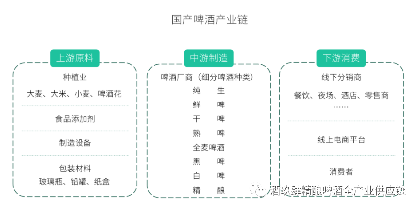 从啤酒产业链整体布局来看,产业链上游参与主体为原材料供应商,涉及种植业、包装材料业与食品添加剂加工制造业等领域,为啤酒厂商提供了大麦(主料)、小麦、酒花等原材料以及玻璃瓶、铝罐、纸盒等包装物材料;产业链中游的参与者为啤酒生产商,代表企业如华润啤酒、青岛啤酒等。