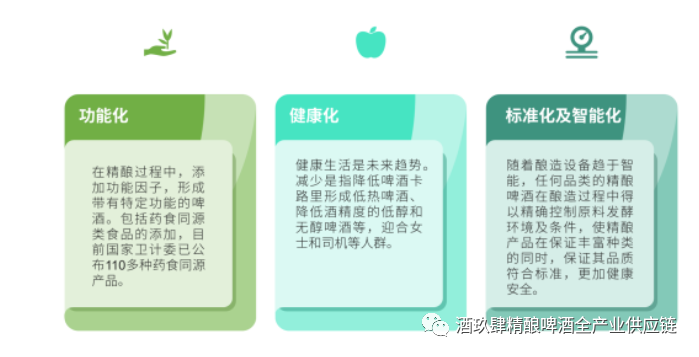 精酿啤酒由于原料纯天然,不额外使用添加剂,因此较工业啤酒更为健康。未来在多种食源辅材的加入下,消费者将不断体验到新类别和具有各种新功能的精酿啤酒;此外,通过智能化的设备,精酿啤酒的生产工艺也会进一步提升。