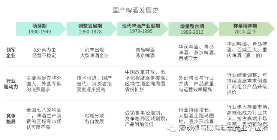 纵观国产啤酒行业百廿年发展历程,国内啤酒行业从最初的外商投资建厂——技术引进、国产替代——快速发展——逐步迈向成熟市场历经多个发展阶段,行业驱动力也逐步由早期的产能扩张逐步向结构提升转变。2013 年全国啤酒产量见顶标志着行业增量竞争的时代逐渐远去,行业寡头格局也基本成型。与此同时,啤酒行业下半场存量博弈逐步拉开序幕。
