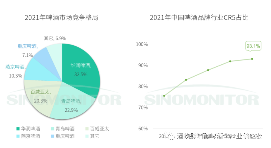 中国啤酒市场呈现出以华润啤酒、青岛啤酒、百威亚太、燕京啤酒和重庆啤酒(嘉士伯)“五强争霸”的局面。根据头部啤酒公司公布的年报显示,在2021年中国啤酒市场中,华润占比32.5%、青岛占比22.9%、百威占比20.3%,燕京啤酒占比10.3%,重庆啤酒占比为7.1%,前五家企业占比超90%。各啤酒企业通过收购本地强势品牌,从而在全国各地建立优势市场,形成群雄割据局面。