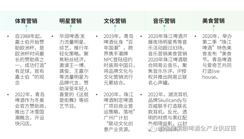 各大品牌的营销策略主要分为体育、明星、文化、音乐、美食营销,通过年轻化策略提升品牌影响力,迎合当下精酿啤酒消费主力群体偏好。