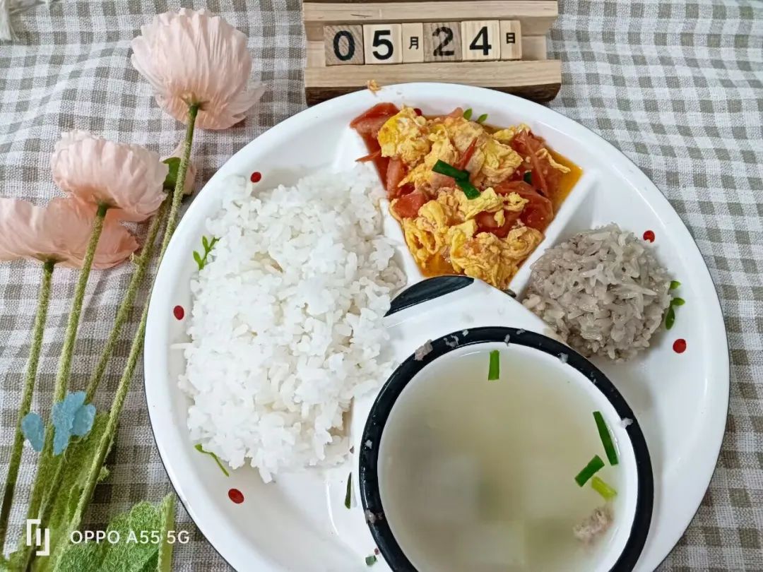 午餐:香米饭、糯米牛肉丸、番茄炒蛋