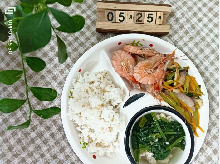 午点:燕麦米饭、盐水大虾、少荃园小 炒、菠菜肉丸汤