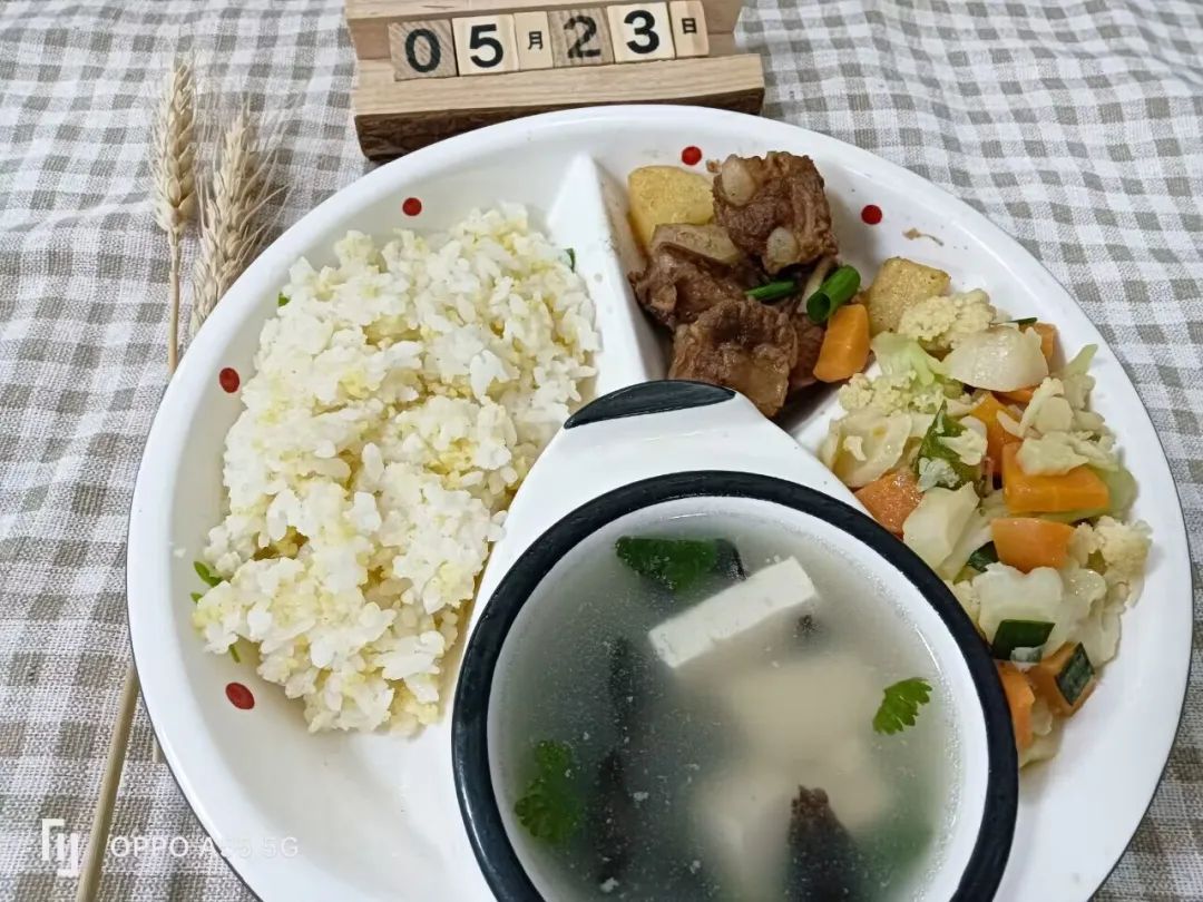 午餐:金银米饭、土豆烧排骨、干锅花 菜、鲫鱼木耳豆腐汤