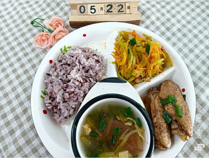 午餐:紫米饭、红烧鸡翅、炒三丝