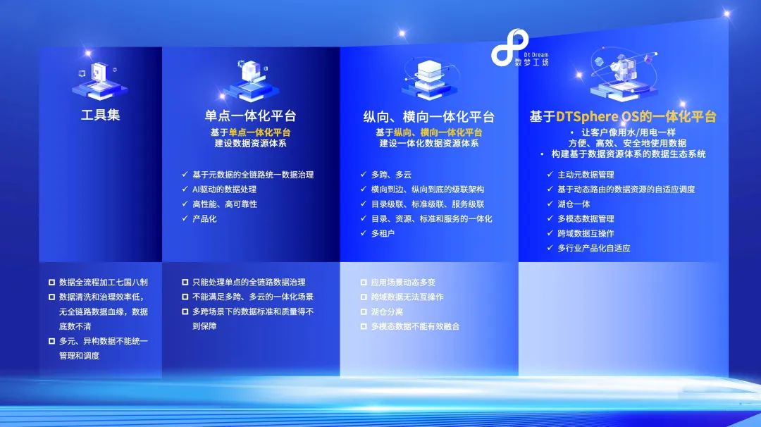 此外,数梦工场助力福建省建设福建省一体化公共数据平台,该项目是全国领先实现湖仓一体化架构的省级一体化公共数据平台,整体由数据服务门户、数据仓库平台、数据湖平台三大板块构成。DTSphere DSC的湖仓一体化数据治理能力采用开放式架构,融合数据湖低成本的数据存储架构优势,同时具备数据仓的多模态数据治理功能。DTSphere DSC针对结构化数据、半结构化数据、非结构化数据和空间数据都拥有成熟的数仓建设方法论,具备在统一操作界面下实现多模态数据治理的能力。王波指出,随着数字中国建设的不断推进,未来我们将面临不同行业的多模态数据治理和融合能力的挑战,同时应用场景的动态多变和跨域数据如何实现互操作也是亟需攻克的技术难点。数梦工场将发挥多年来服务头部客户累积的实践经验优势,与各位行业专家共同探索一体化数据资源体系建设之路。本届数博会汇聚全球顶尖行业领袖,并邀请国内外知名学者、企业家,聚焦数字中国发展战略,共话数字未来。王波感慨:“我们在最好的时代,走在最好的大道上。”
