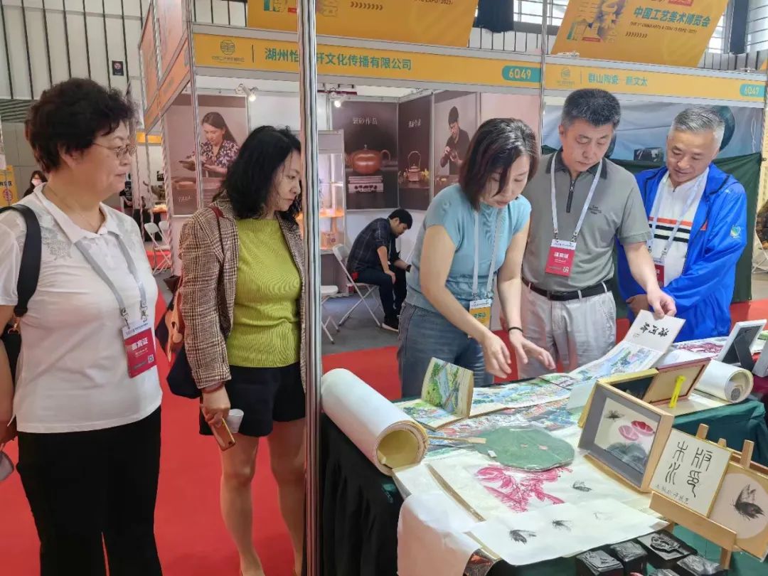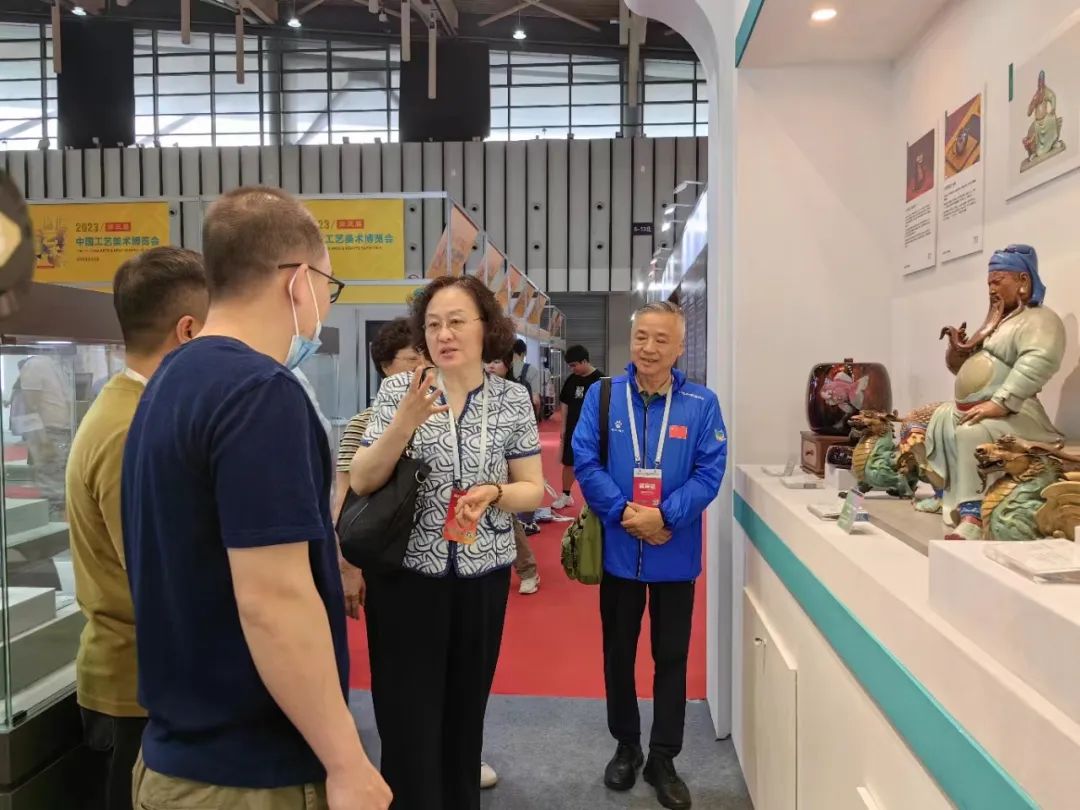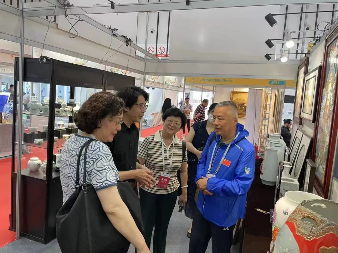 展会期间中国工艺美术协会常务副理事长张红、天津市商务局副局长李宏、天津市工业和信息化局消费品处处长高君、天津市商务局会展处处长施纯一行参观考察了本届博览会和天津展团展位,天津市工艺美术行业协会理事长刘强、秘书长洪琴英、副秘书长马世萍陪同。