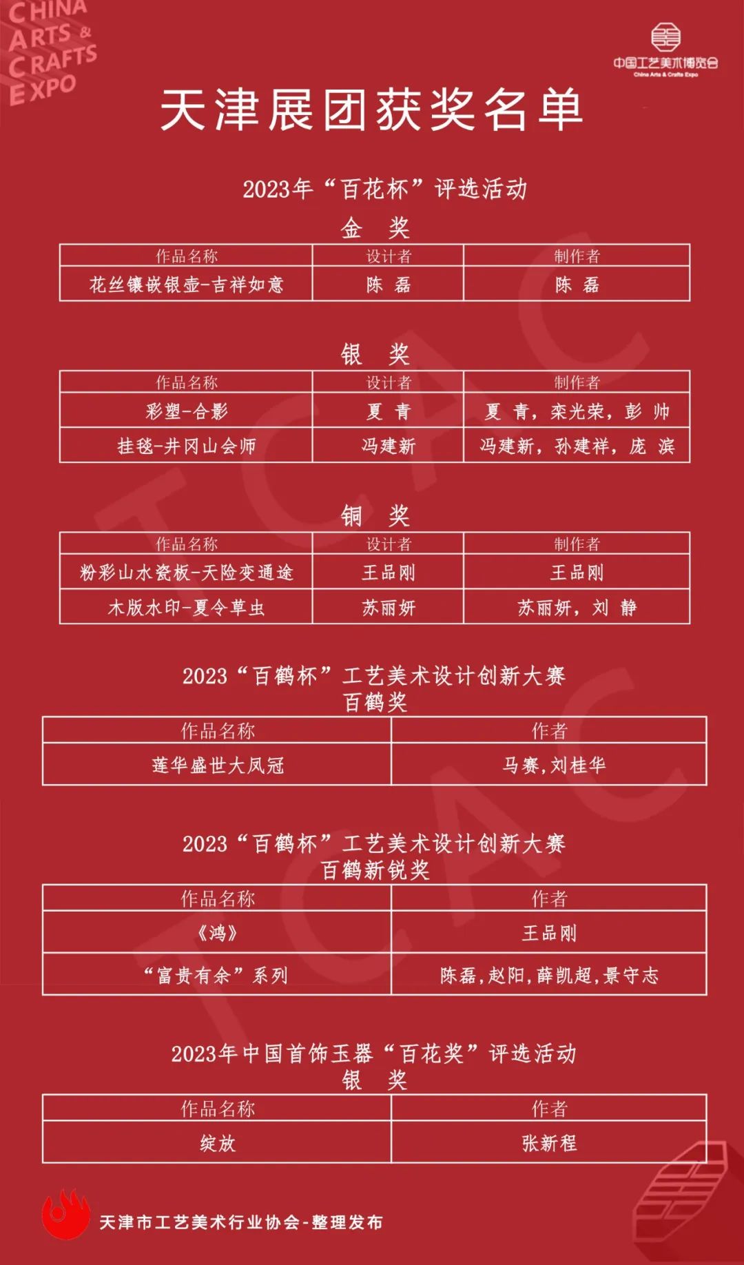 5月29日,第三届中国工艺美术博览会“百鹤杯”工艺美术设计创新大赛、中国工艺美术“百花杯”、中国首饰玉器百花奖评选活动揭晓,在众多参评作品中,经专家组评审,天津展团取得优异成绩,共荣获9个奖项,其中 “百花杯”金奖1件/套、银奖2件/套、铜奖1件/套;“百鹤奖” 1件/套,“百鹤新锐奖” 3件/套;“百花奖银奖”1件/套、展示了天津工美的艺术创新力和匠人精神。