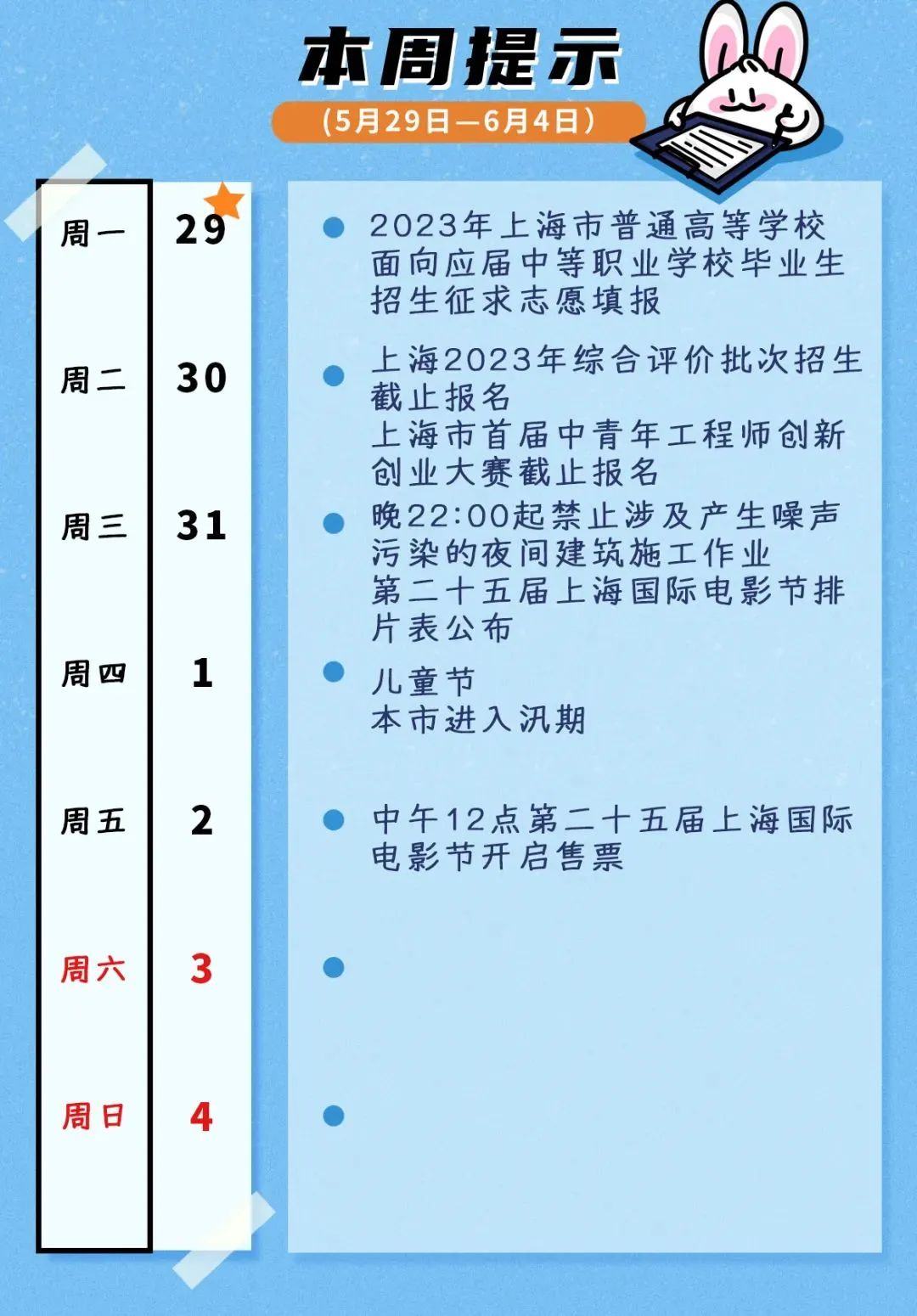 本市进入汛期、首届中青年工程师创新创业大赛截止报名、第二十五届上海国际电影节开票……本周还有哪些大事?速看本周提示↓