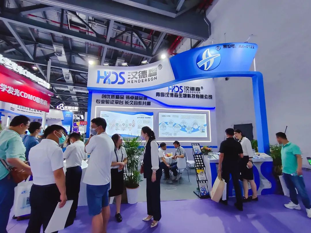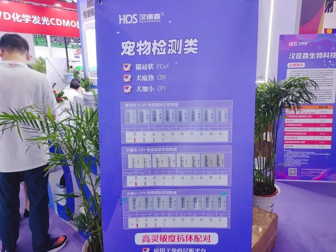 在「A4-0122」青岛汉德森展台,本次展出了传染病系列、炎症系列、心脑血管疾病系列、毒品系列、宠物系列,肿瘤标志物系列,生物素,科研抗体系列等众多领域体外诊断试剂核心原料,吸引了众多IVD企业上下游同业者交流与探讨。