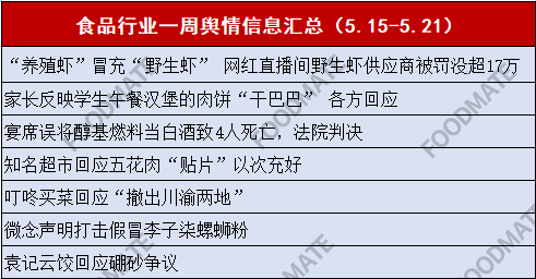 食品伙伴网讯 5月22日-5月28日食品行业舆情信息有: “养殖虾”冒充“野生虾” 网红直播间野生虾供应商被罚没超17万 近日,“东方甄选”原野生虾供应商青岛浪海情经贸有限公司因违反食品安全法,被即墨区市场监督管理局罚款16.68万元、没收违法所得4100元,共计17.09万元。 经查,当事人经营涉案食品加工原料生产方式为“养殖”,但食品包装标识有“太平洋大虾 100%野生”等字样。 据悉,今年3月,“东方甄选养殖虾当野生虾卖”的话题登上热搜,有消费者投诉“东方甄选”将养殖虾当野生卖,引发网友关注。对此,“东方甄选”回应称系被供应商欺骗,该批养殖虾来自合作商浪海情公司,早前已将该品牌拉黑。 5月23日,黑龙江双鸭山学生家长反映孩子从学校带回来的午餐汉堡的肉饼黑乎乎、干巴巴,吃起来像合成肉。据悉,该午餐由双鸭山恒康餐饮管理有限公司集贤县分公司提供,每份14元。 5月24日,涉事餐饮企业工作人员解释汉堡中肉为何看上去很硬,可能是晚上拿回家风干了,就有点硬,正常中午吃应该是软的,这是第一次做,如果出现不好的情况,肯定会改的。 双鸭山尖山区教体局相关负责人称已关注到此事并约谈餐饮企业整改,集贤县和双鸭山市场监督管理部门已经介入调查。 近日,重庆市南川区人民法院判决了一起过失致人死亡案。 2020年12月,王某在村里办嫁女宴席,购买了2桶散装白酒放在家中,还买了2桶醇基液体燃料用于宴席烧灶炒菜用。张某宴席中负责帮忙倒酒,误将醇基燃料认成白酒。其间,张某及宾客品尝后感觉味道有异,但在场人均以为是酒壶问题,张某便停止了倒酒。早餐后,张某意识到酒可能倒错了,却未告知他人。之后张某仍用有醇基燃料的酒壶去灌白酒。事故致4人甲醇中毒死亡,数名宾客因中毒被送医。 南川法院经审理认为,张某和王某的行为均已构成过失致人死亡罪。分别以张某、王某犯过失致人死亡罪,判处有期徒刑三年,缓刑四年。 5月25日,安徽安庆,女子称在大润发买到“贴片”五花肉,一盒五花肉里,前两块是正常的,后三块却都是披着“五花肉”皮的肥肉。 对此,门店肉柜负责人表示,五花肉分为三个档次,女子购买的13.8元这一档,肥肉相对比较多,自己已经教育了员工,以后五花肉该卖什么价格卖什么价格,不要做欲盖弥彰的动作。此外,赔偿了顾客一块精品五花肉作为补偿。 5月22日,“叮咚买菜将撤城川渝”的话题引发关注。 据报道,从内部知情人士处获悉,叮咚买菜将于本月29日关闭西南地区业务,停止成都、重庆两城的服务。据了解,此次业务调整将涉及1000多名在地及外包员工,目前员工赔偿方案仍未确定,内部将提供转岗机会。 对此,据报道,叮咚方面表示,近期,公司基于降本增效的考虑,对重庆、成都业务进行了调整,暂停了相关区域的服务。本次调整不影响公司在其他区域的正常经营。 近日,微念公众号发布声明称收到举报线索反馈部分区域出现了“李子柒”柳州螺蛳粉的假冒包材和假冒伪劣产品,公司已聘请专业团队与各地执法部门联系,目前在售假货、假冒包材被查封和扣押。微念表示将持续维权并追究侵权行为人的法律责任。 5月25日,袁记云饺官方微博发布声明称,近日,网上出现袁记云饺含有硼砂的不实信息,误导消费者,严重损害了袁记云饺品牌声誉。对此公司郑重声明:袁记云饺从未添加硼砂,请放心食用。对用不实信息损害广东省袁记食品集团合法权益的行为,公司将保留对制造不实信息、误导公共舆论者依法追究法律责任的权利。来源:食品伙伴网
