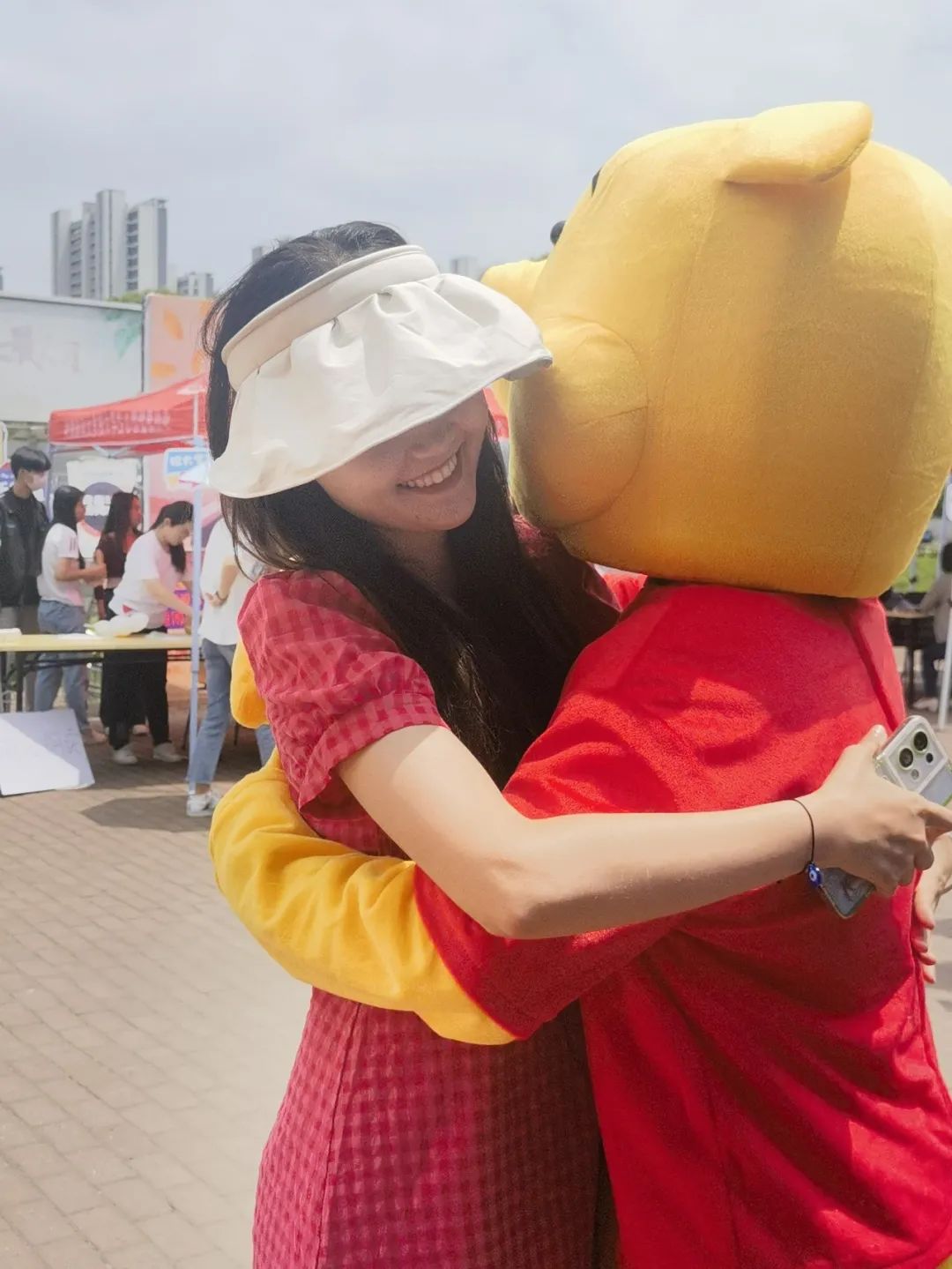 我们身穿玩偶服,在食堂展台处给予想要拥抱的同学拥抱,拥抱是最好的解压方式,是连结情感的身体语言。温暖的拥抱能够给予同学们力量,消除坏情绪,让同学们感受到校园中的温情,激励同学积极拥抱生活。
