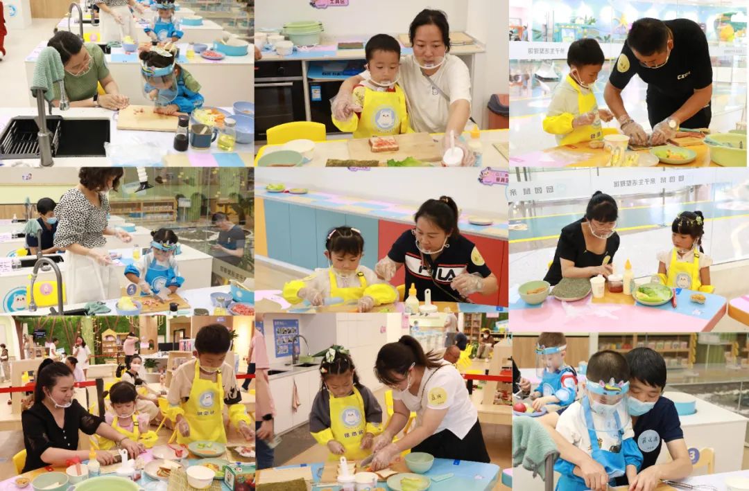 10余组亲子家庭在老师的带领下分为两组,体验中厨区和西餐区烹饪活动。红辣椒、西红柿、胡萝卜、鸡胸肉......在中厨区,小朋友们在大朋友的帮助下学习中式美食的制作方法与技巧,小心翼翼地学做美食,切菜调味、自主烹饪,同时了解菜系的知识,培养收纳复原厨具的良好习惯。西厨区实践课中,家长和小朋友们分工合作,有的卷寿司,有的制作三明治,有的涂沙拉酱,有的拿盘子……忙的不亦乐乎。