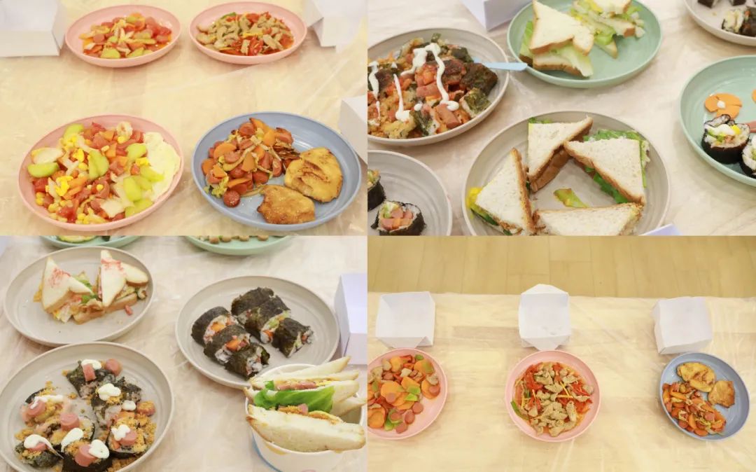 不一会儿,鲜香的西红柿炒鸡蛋、色香味俱全的红辣椒炒肉、美味的寿司、颜值爆表的三明治都制作完成,家长与孩子们一同品尝了亲手制作的美食,为孩子们的厨艺竖起了大拇指,露出了欣慰的笑容,纷纷拿出了手机拍照打卡留念。