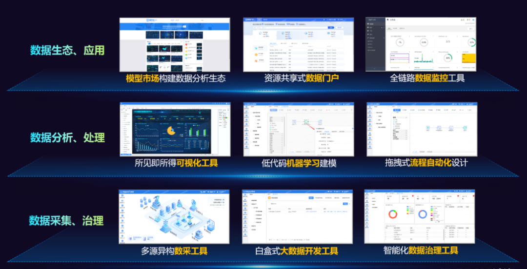 针对数据集成难、数据治理难、数据价值发挥难三大难题,平台提供三层九大工具,帮助企业打造权威准确的数据资产中心,并以可视化、深度数据价值挖掘和流程自动化改造等形式实现数据资产价值化,支撑企业运营和决策,同时打造数据应用生态,提升数据应用体验感。