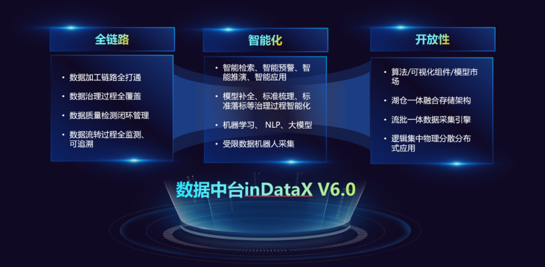 结合新技术,赋能数据管理全流程,如多源异构数据自动采集、数据模型自动补齐、数据标准自动映射、质量检测结果自动推送、数据异常自动报警、全域数据智能检索、关联数据智能推荐等数据应用场景,提高数据管理效能,提升用户体验,引领未来企业数据中台应用新模式。