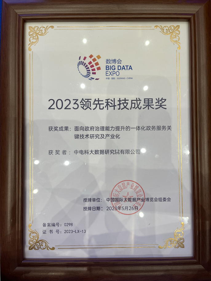 5月26日,2023中国国际大数据产业博览会领先科技成果发布会在贵州省贵阳市举行,会上公布了20项领先科技成果以及51项优秀科技成果。中电科大数据院作为大数据国家工程研究中心建设运营主体,牵头攻关的“面向政府治理能力提升的一体化政务服务关键技术及产业化”荣获“2023中国国际大数据产业博览会领先科技成果”奖项。