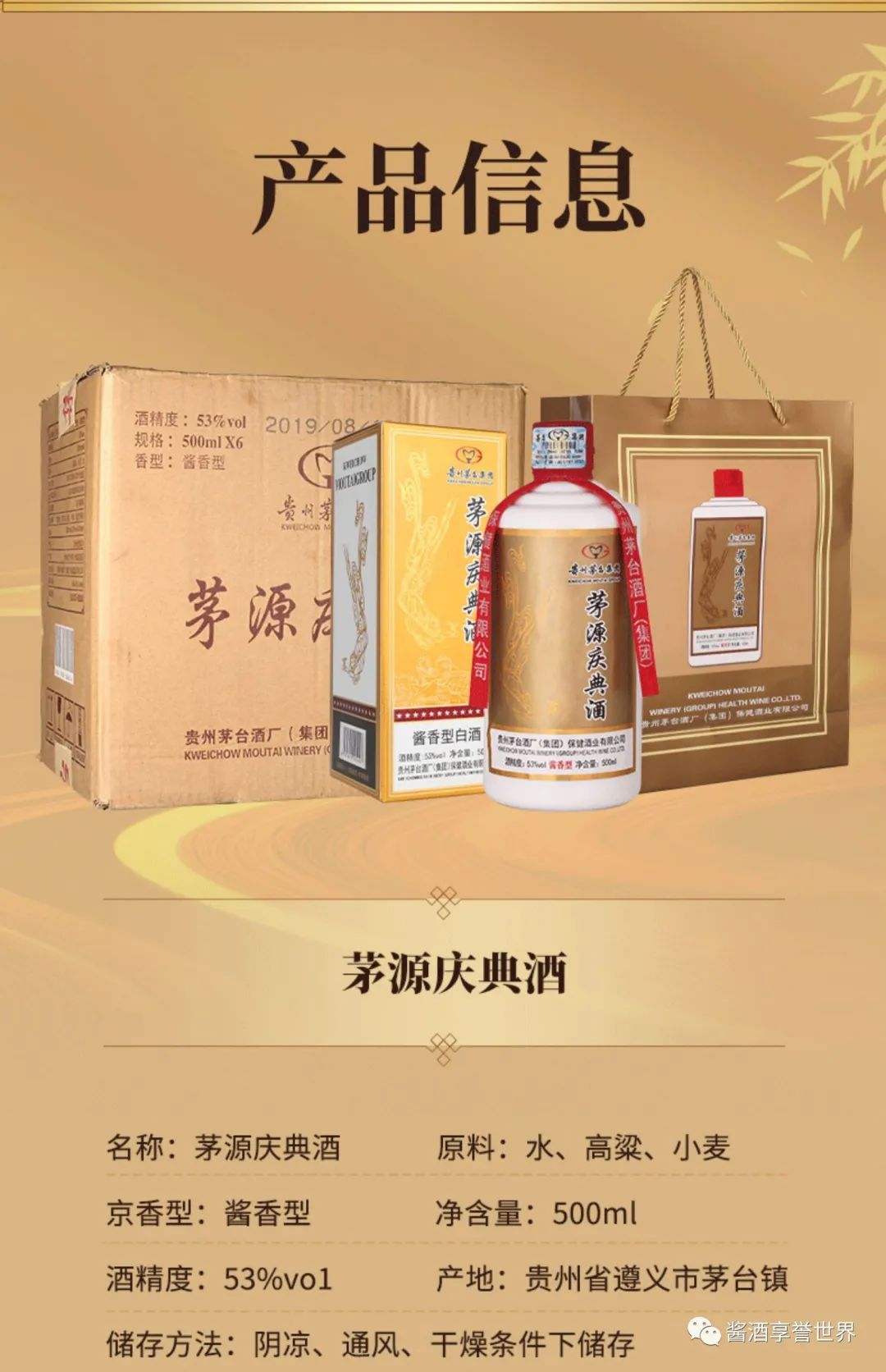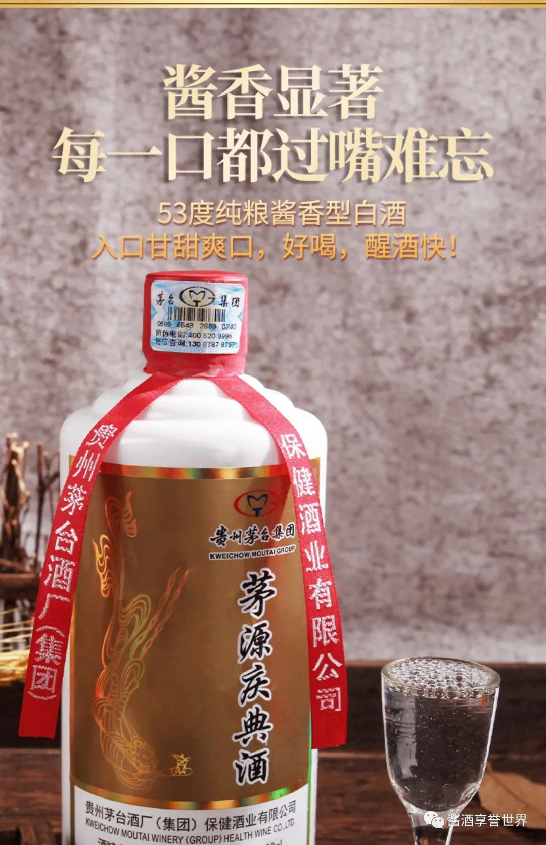 生产厂家:贵州茅台酒厂(集团)保健酒业有限公司所生产,与国酒茅台一脉相承。这款53度酱香型白酒产自贵州遵义仁怀市,选用水、高粱、小麦为原料酿制而成。酒液微黄透明,酱香幽雅协调,入口绵柔醇和,饮后回味悠长,空杯留香持久。红布缠绕瓶盖,寓意喜庆、吉祥。适合商务宴请、节日赠礼、珍藏自饮等。