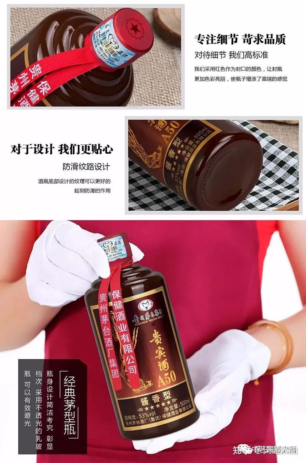 贵宾酒a50整体采用酱色,质朴中透露沉稳、大气。导致贵宾酒a50热销的原因众多,首先是每瓶配备两个茅台集团小酒杯,其次是设计风格和名称。一款热销的产品会被众人盯上,仿品横行,大多数消费者被迷惑不知情。