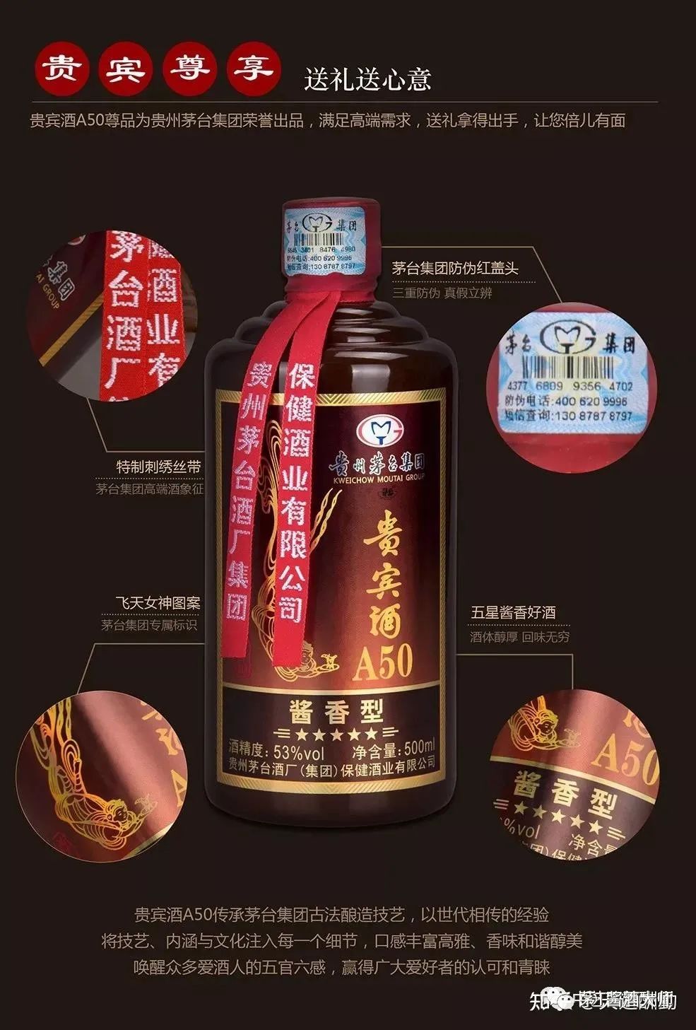 这款贵宾酒A50尊品市场评价极高,是一款高品质美酒,顺应天地人和,农节时令,从制曲、制酒、贮存、勾兑到包装。一瓶贵宾酒从投料就经过30道工序和165个工艺环节的锤炼,至少要5年时间陈年老熟,这款酒适合商务宴请,过节送礼!