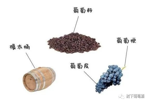 单宁主要来自于葡萄皮和果实的籽,也会来源于橡木桶。单宁会随着时间的推移而逐渐结合起来,形成更复杂的化合物,这就是为什么老年葡萄酒通常具有更为复杂的味道和口感,老酒的沉淀物大多也是结合后的单宁。