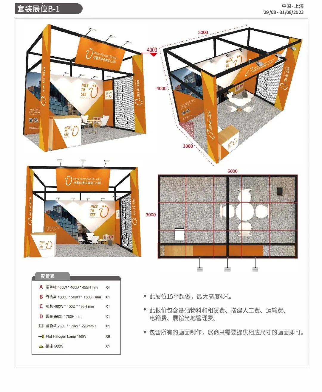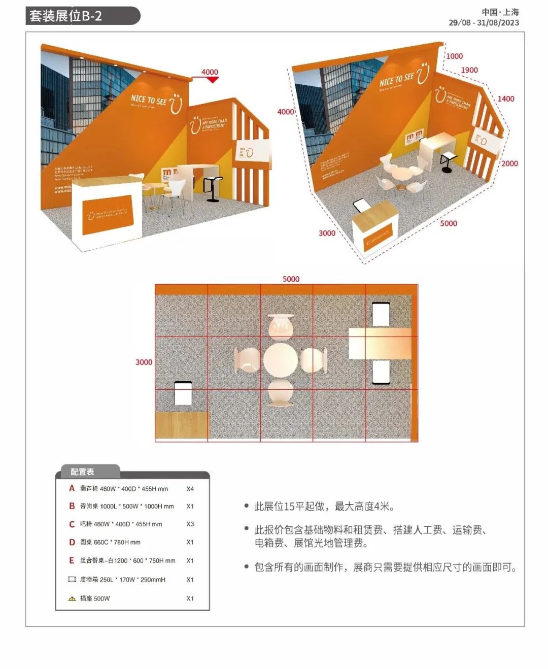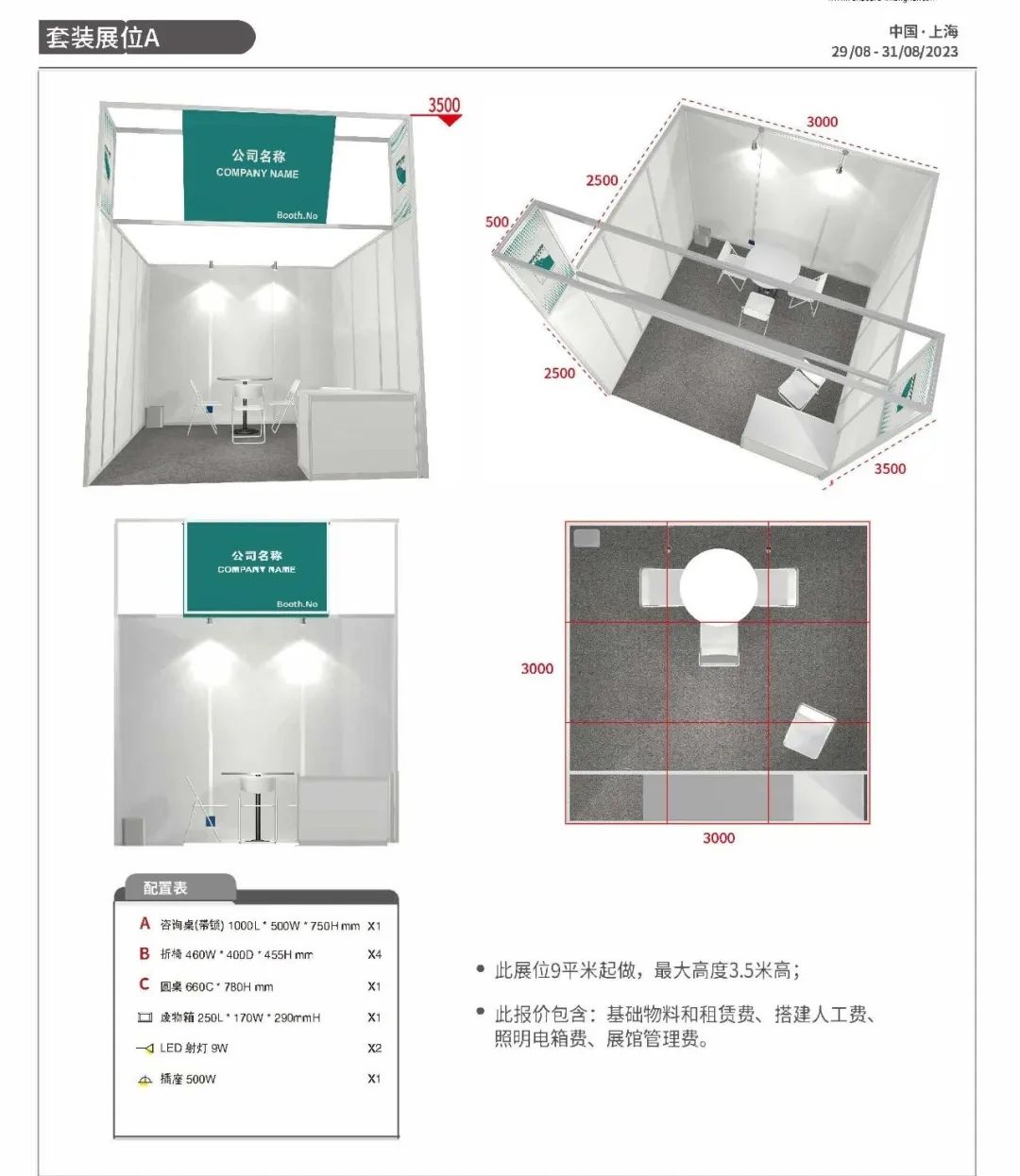展位全部为精装修展位 。标准展位搭建有 A.B二种套餐和3种型号供企业选择如上图 。展会光地展位1388元/平方米(20平方米起租),标准展位全部为精装修展位(如上图)