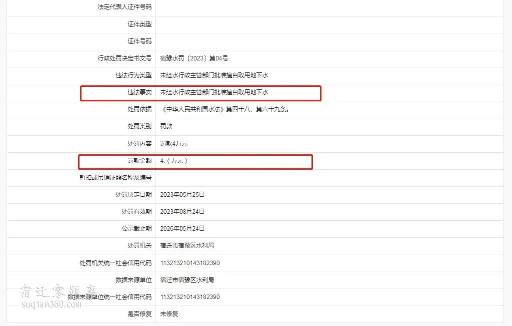 据信用中国(江苏宿迁)官方网站处罚公示信息,2023年5月25日,江苏益客食品集团股份有限公司因未经水行政主管部门批准擅自取用地下水的行为,被罚款4(万元)