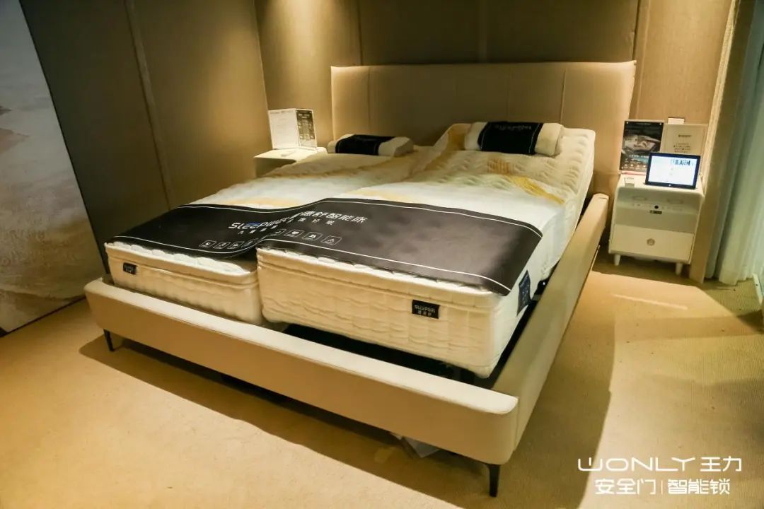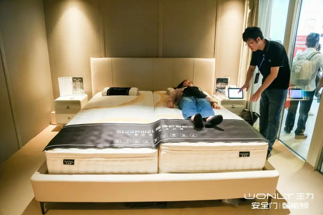 爱感展区别出心裁地搭建了全场首个也是唯一一个睡眠体验中心,在众多门锁产品中让观众眼前一亮,纷纷前来体验。睡眠体验中心采用隔音设计,结合系列产品真实还原家中卧室场景:睡德舒智能床、安睡伴侣、智能床头柜、空净消毒机、智能窗帘等营造了完美睡眠环境,让客户就算是身处嘈杂的展会环境,也能第一时间放松舒缓,拥有睡意。