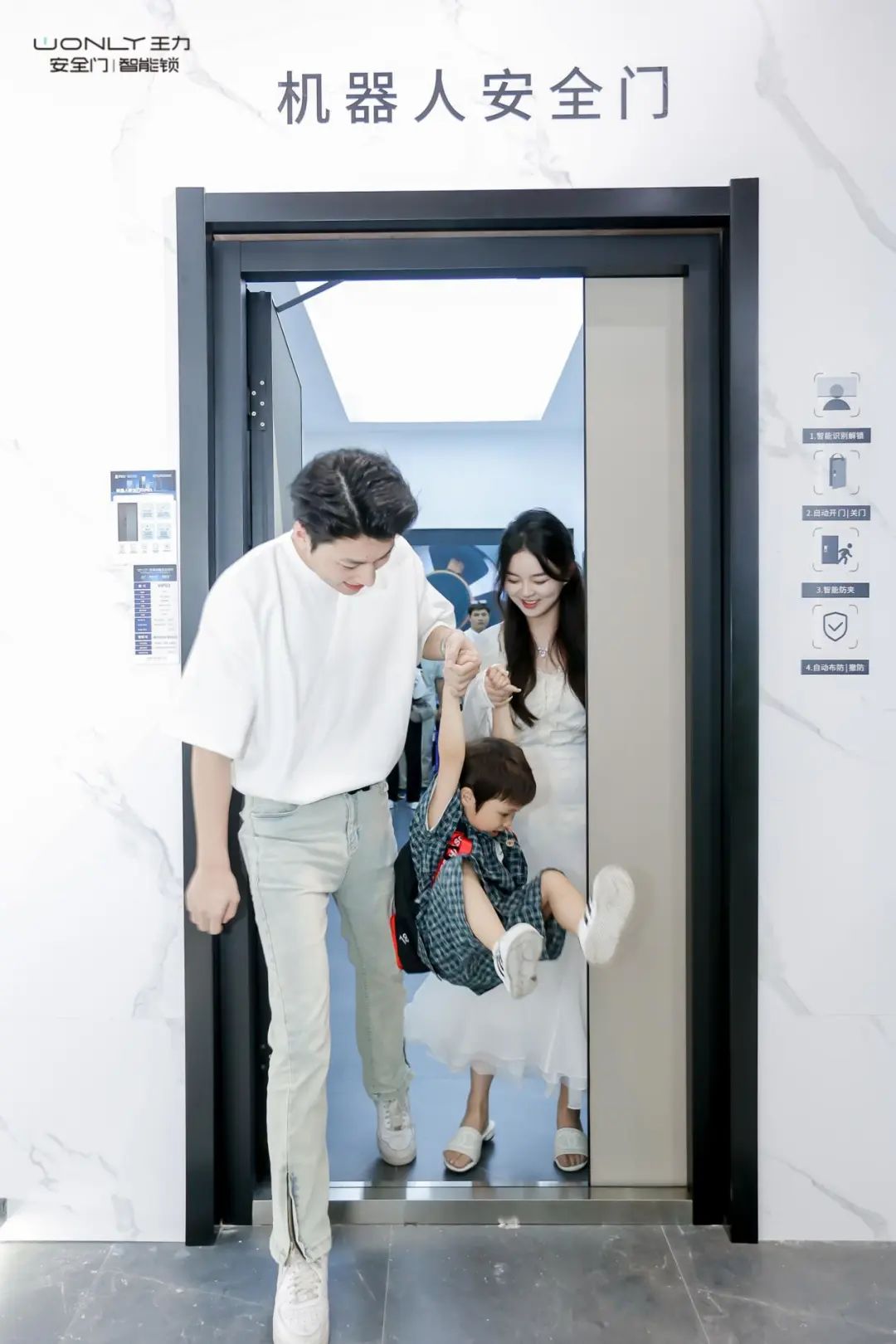 为了更好地向观众展现王力第三代机器人安全门智能识别解锁、自动开丨关门、智能防夹、自动布防丨撤防的四大“硬核黑科技”,王力安防副总裁胡造奇在现场征集了一家三口,还原生活中的真实使用场景,体验感满满。