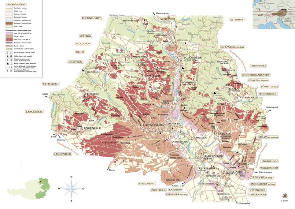 靠近多瑙河(Danube)的葡萄园土层结构有所改变, 绿维特利娜(Grüner Veltliner)种植在黄土和泥灰土的梯田葡萄园中,经常能展现白胡椒等香料的气息。坎普谷(Kamptal)奥地利法定产区(DAC)的葡萄酒,只能由雷司令(Riesling)和绿维特利娜(Grüner Veltliner)为主要品种酿造,并且必须为干型。