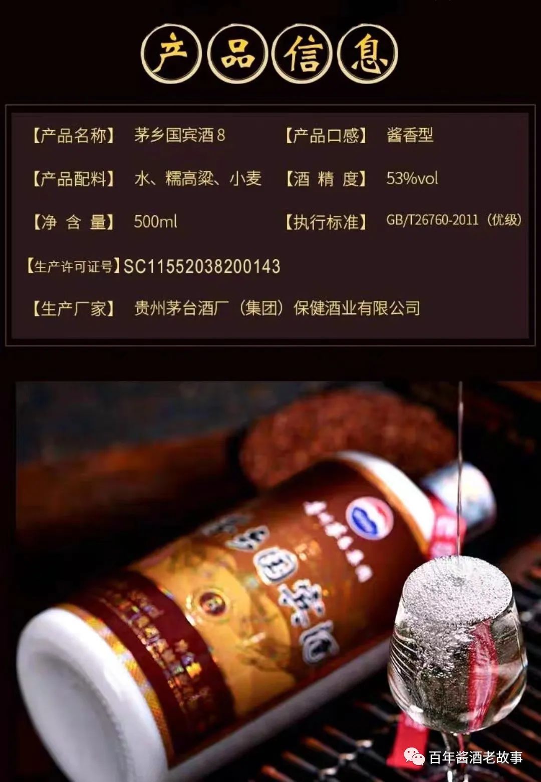 贵宾(8)一款酒是茅乡国宾酒茅台酒系列产品。茅乡国宾酒是以优质高粱、小麦为原料,秉承茅台酒传统工艺、精心酿造、勾兑而成的优质酱香型白酒。茅乡国宾酒具有酱香明显、幽雅舒适、协调醇和、回味较长、空杯留香,饮后不上头的特点