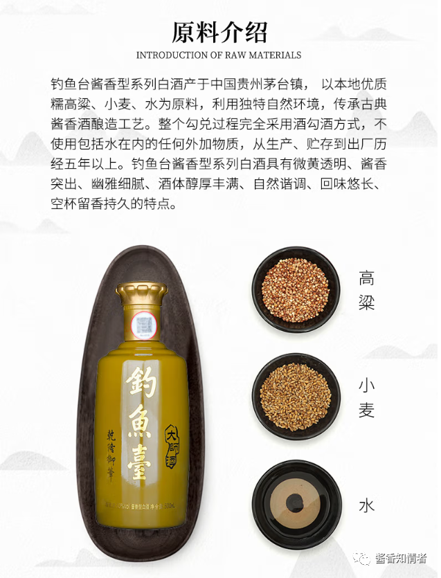 钓鱼台酒有大师酒不是属于系列酒,而是酱香酒,味道口碑良好,酒香较纯。其采用红缨高粱酿制,确切的说是红缨子糯高粱。原材料上也显示不出那里贵,在看看工艺,酱香酒的工艺可以概括为“12987”工艺。钓鱼台酒有大师酒不是生产完就可以直接装瓶,还有经过一段时间的贮存才能上市。期间不加入任何的添加剂包括水的参入,都是酒勾酒来今天调口感。