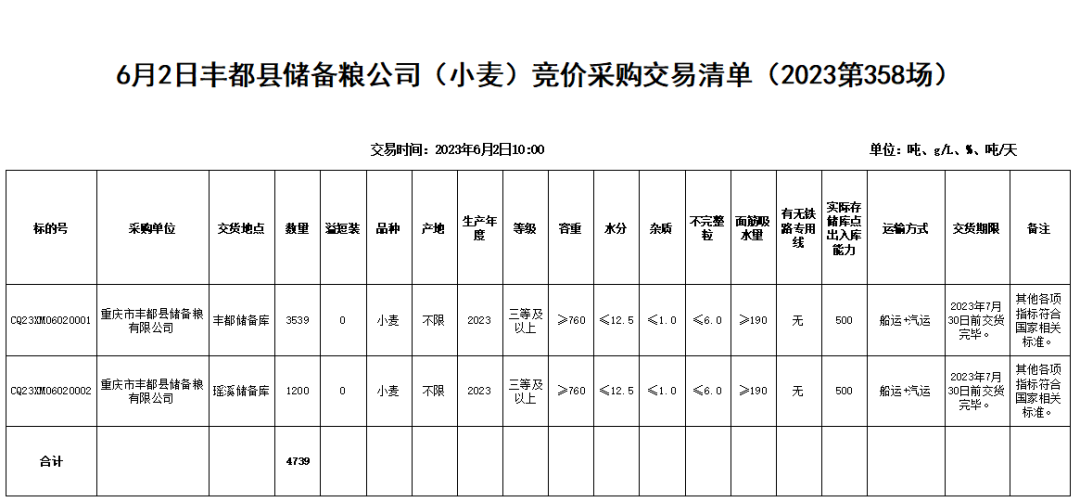 受重庆市丰都县储备粮有限公司委托,重庆市粮油批发市场有限责任公司(即国家粮食重庆交易中心,以下简称“批发市场”)定于2023年6月2日10:00举办丰都县储备粮公司(小麦)竞价采购交易会,现将有关事项公告如下: