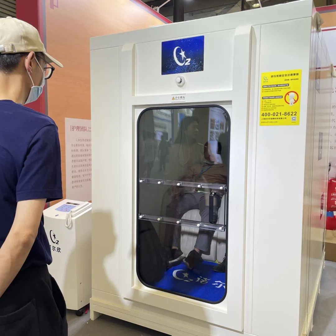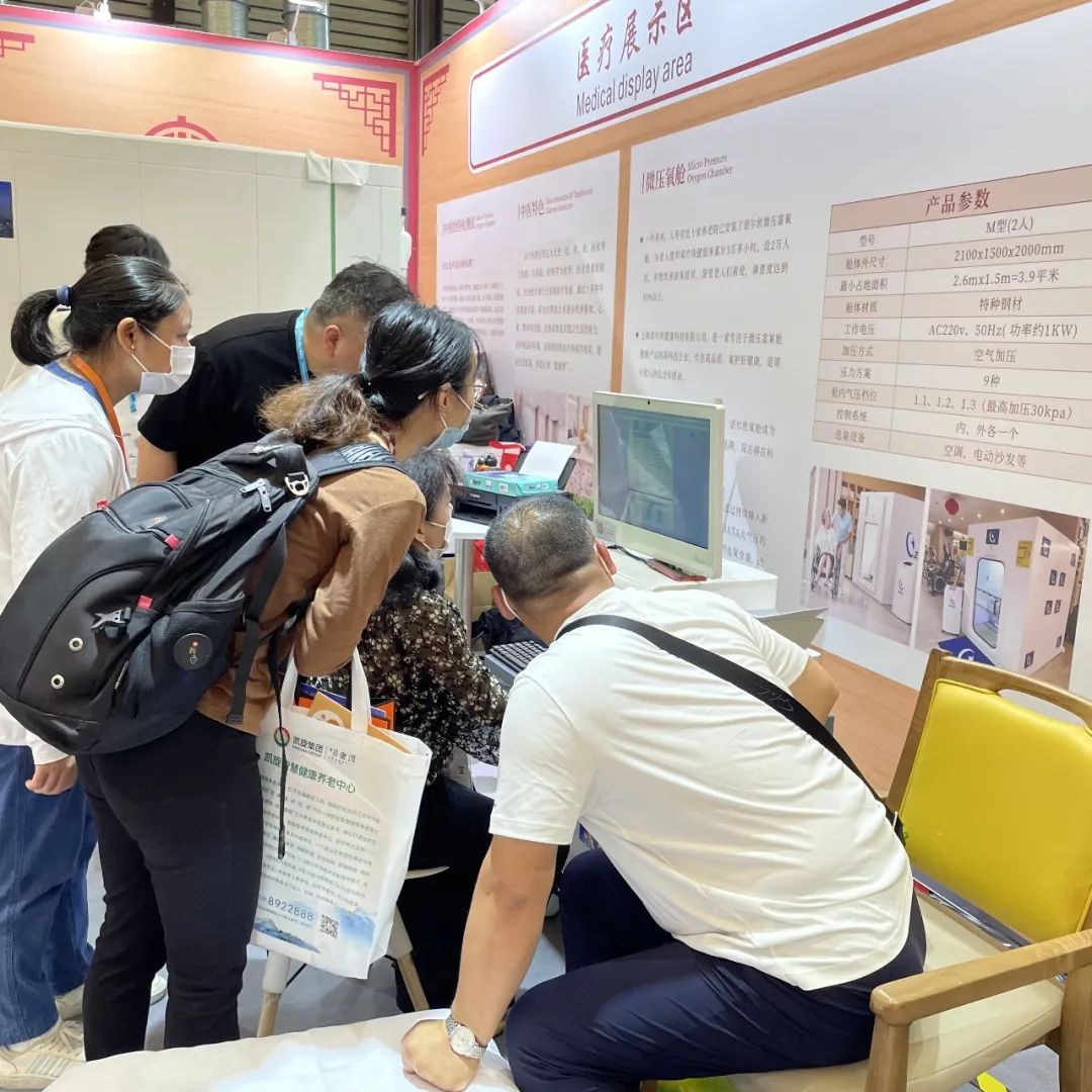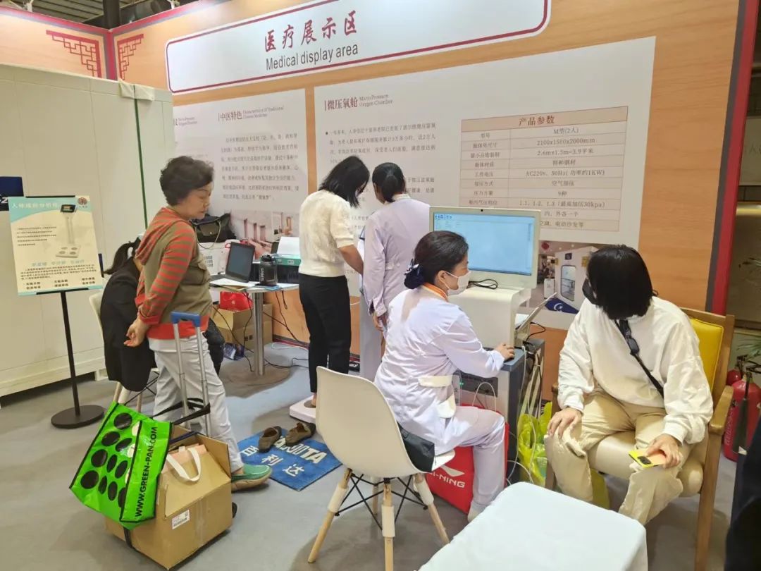 我们也将微压氧舱和中医经络检测仪搬至会场,本次老博会的参观者可以免费体验科技助力养老服务。