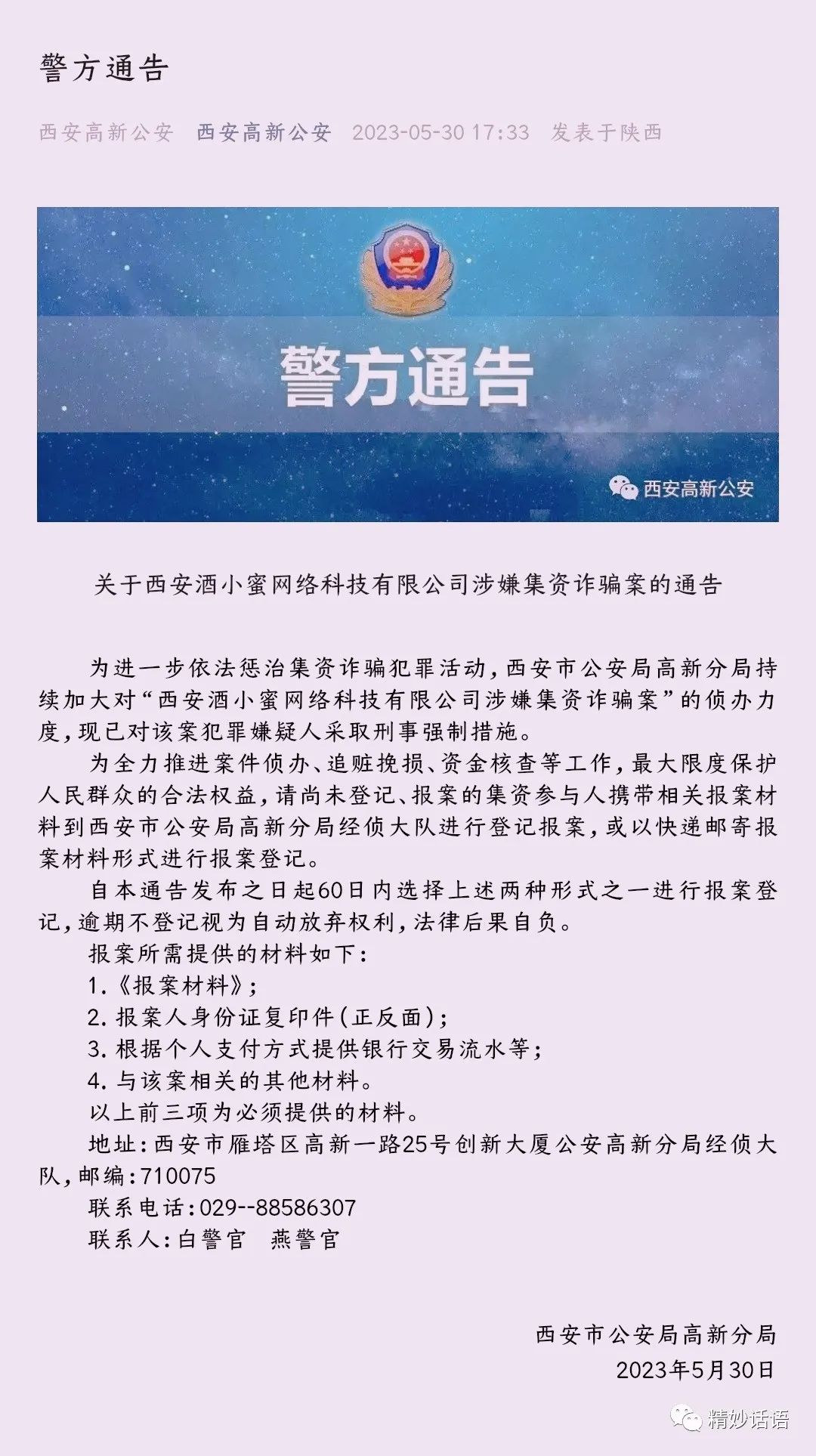 2023年5月30日,西安市公安局高新分局对外发布了关于西安酒小蜜网络科技有限公司涉嫌集资诈骗案的通告。具体如下: