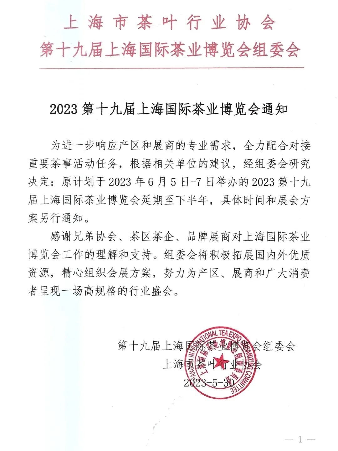 为进一步响应产区和展商的专业需求,全力配合对接重要茶事活动任务,原计划2023年6月5日开幕的第十九届上海国际茶业博览会将延期至下半年举行。为此,组委会就相关事宜通知如下: