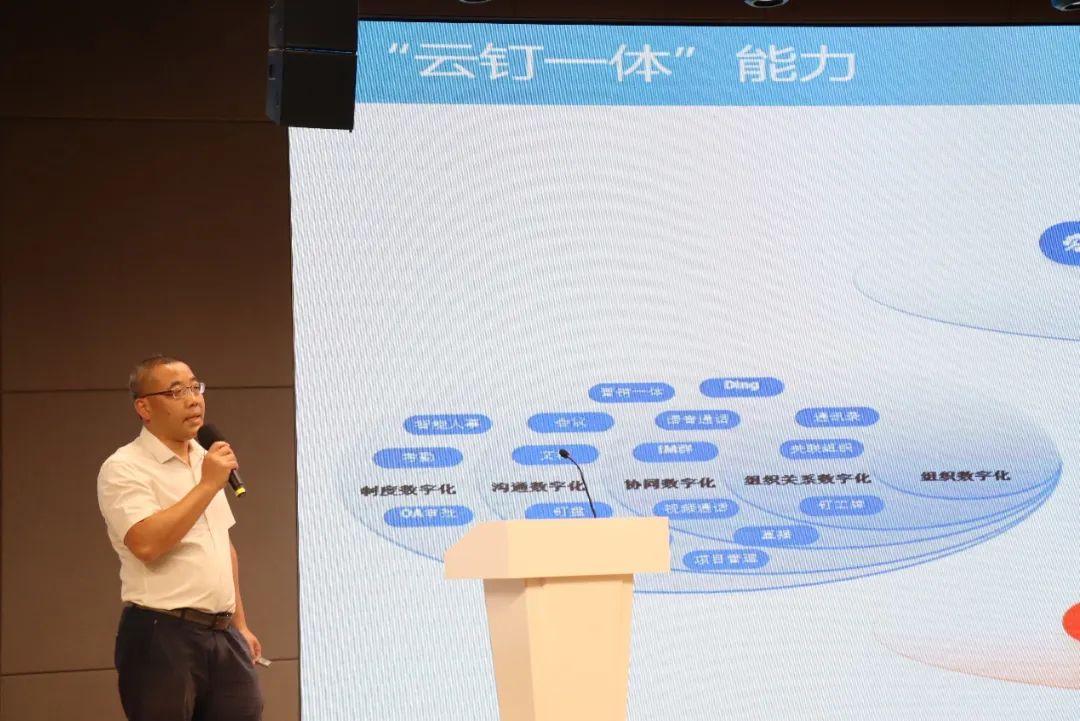 随后,各参会企业进行了内容分享,其中广州爱丁科技有限公司总经理梁泽权分享了钉钉助力企业数字化降低门槛的重要演讲。他提到,当前最大的机遇在于实体经济的发展和数字经济的高度融合。梁总经理强调,钉钉致力于降低中国企业的数字化门槛,助力企业数实融合,实现产业互联时代、数字产业化,业务流管理数字化,一个钉钉就能解决。